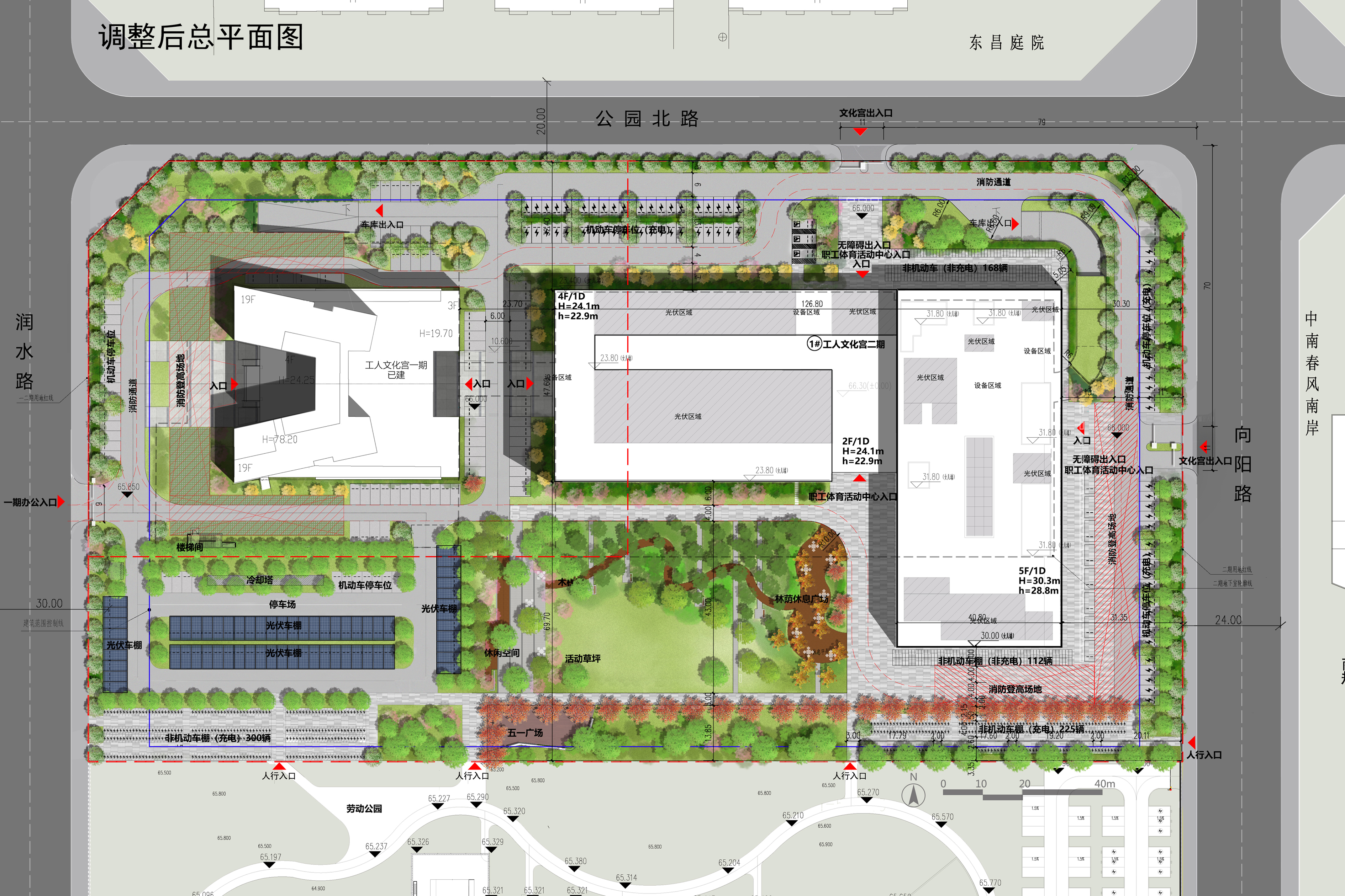调整内容原规划西南机动车停车场整体向南移动机动车停车位增设光伏雨棚设施;西南非机动车停车场向南、向东移动取消南侧1层工人之家(80㎡)。