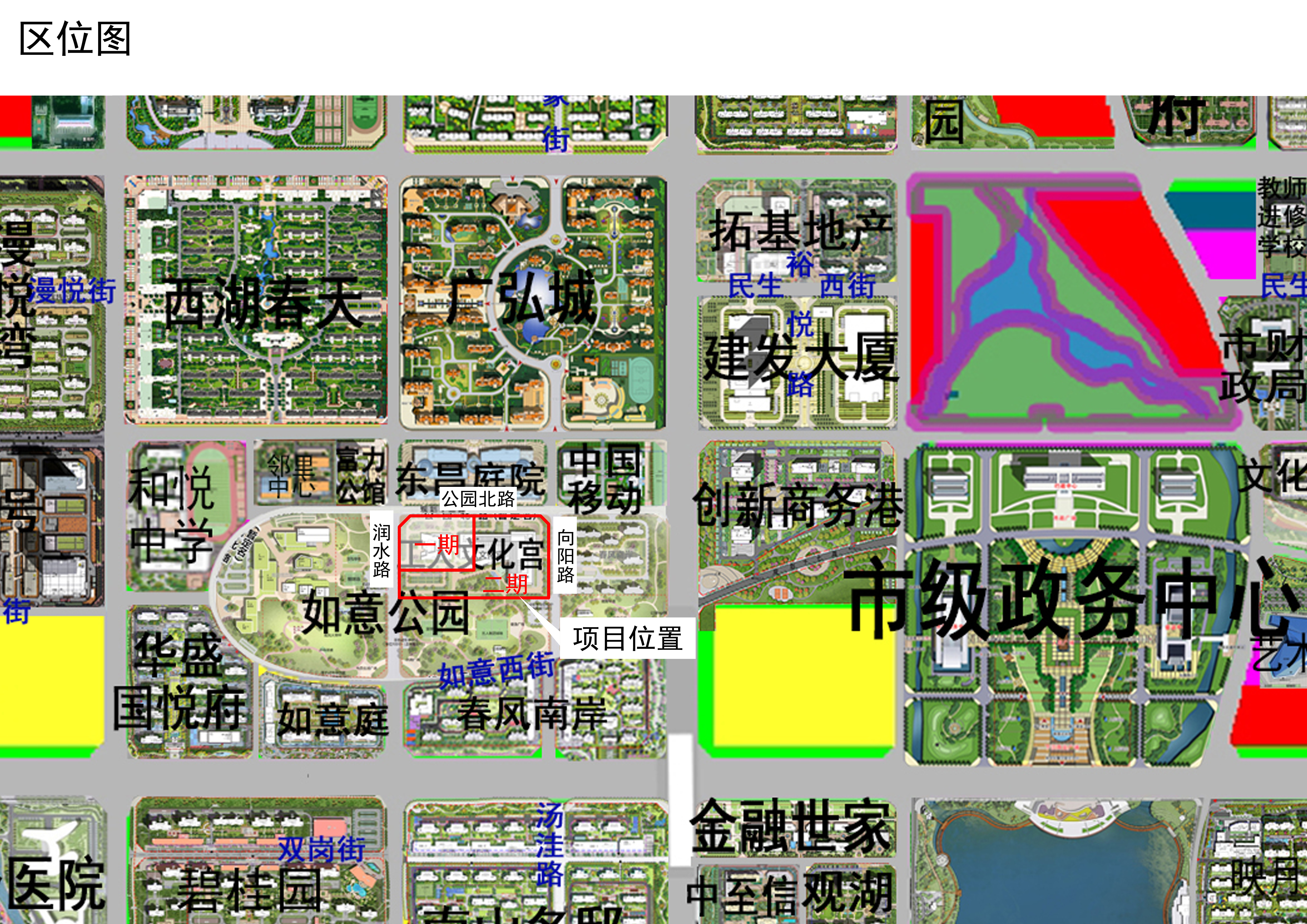 项目地块位于高新区润水路东侧、公园北路南侧、向阳路西侧,南侧为如意公园。一期用地面积13333.33㎡(约合20亩),二期项目位于一期东侧,用地面积约27303.48㎡(约合40.96亩)。一二期合计用地面积40636.81㎡(约合60.96亩)。