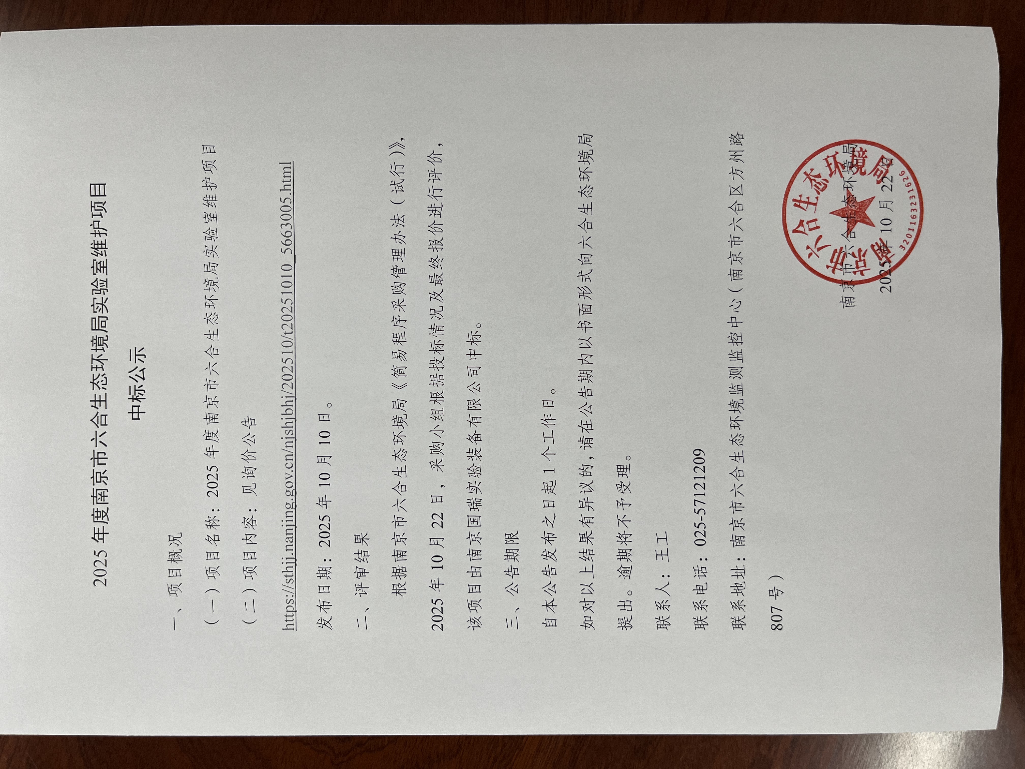 文件下载: | 2025年度南京市六合生态环境局实验室维护项目中标公示.jpg | ||