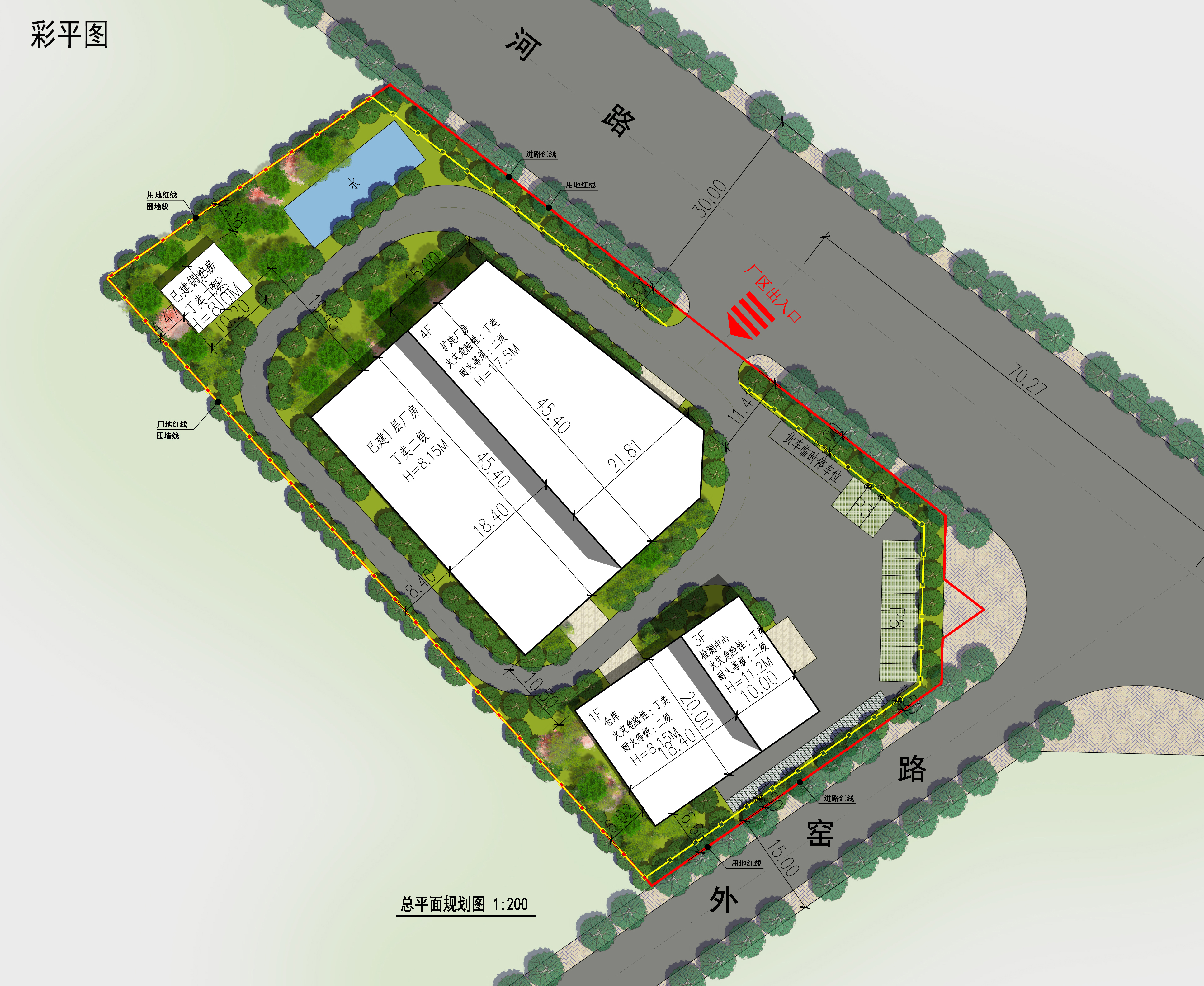 项目位于上窑工业集聚区窑河路西侧、外窑路北侧。本次新建1栋4层丁类厂房、1栋丁类仓库及1栋3层检测中心。项目规划总用地面积约6631.92㎡(9.95亩),厂区用地面积(计容用地面积)约6166.56㎡,规划总建筑面积约5229.4㎡(其中新建总建筑面积约4310.4㎡),计容建筑面积约6516.4㎡(其中新建计容总建筑面积约4678.4㎡);容积率约1.06,建筑系数约40%,绿地率约10.4%。