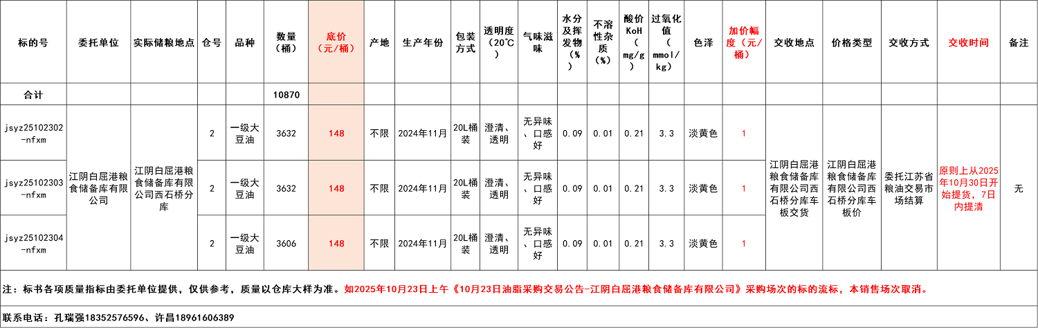 1.品种:2024年11月产一级大豆油(详见交易清单);